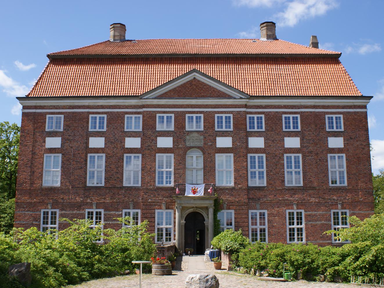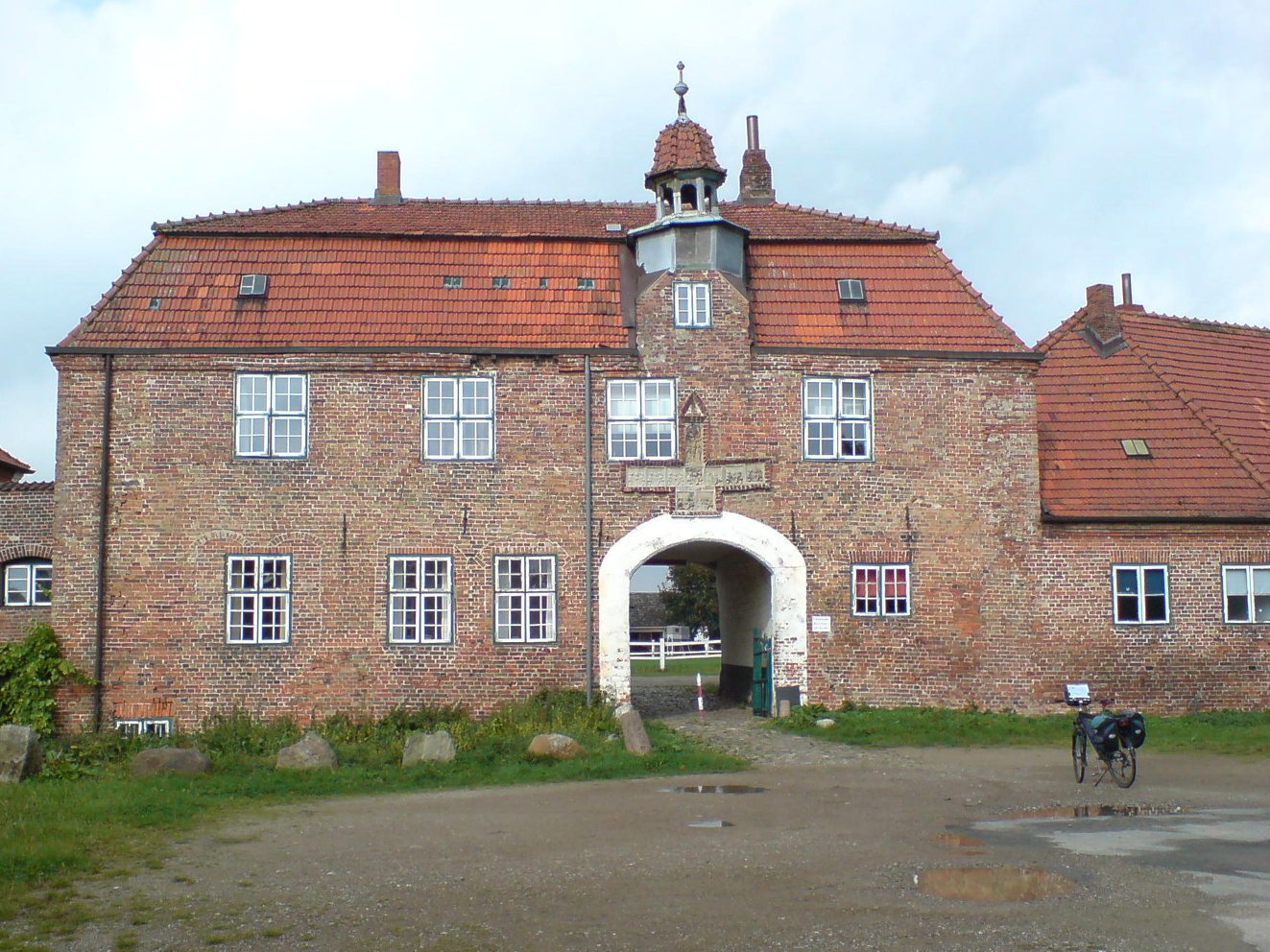 das barocke Herrenhaus von Anfang des 18. Jh. nicht zu übersehen, das an der Stelle einer ehemaligen Wasserburg steht und noch heute nur über zwei schmale Stege zugänglich ist (Foto: PodracerHH). Im Innern beherbergt es u.a. die sogenannte Bunte Kammer, ein vertäfelter Raum mit 145 kleinen Bildern und Sinnsprüchen, die aus einem Vorgängerbau übernommen wurden. Heutzutage dient die Bunte Kammer auch als Trauzimmer, und da passt es nur zu gut, dass einer der Sinnsprüche lautet: Omnia vincit amor! (lat. für „Liebe besiegt alles“).