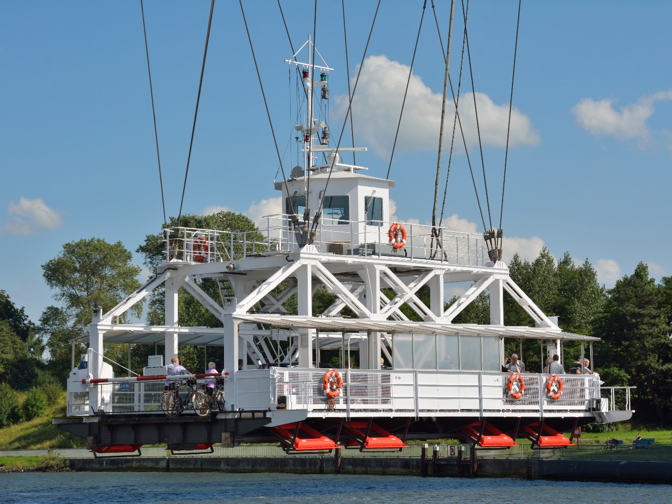 Eisenbahnhochbrücke in RendsburgDa diese Wasserstraße bald den Anforderungen nicht mehr genügte, wurde der Bau des Nord-Ostsee-Kanals in Angriff und dieser 1895 in Betrieb genommen. Dem verdankt Rendsburg sein Wahrzeichen, nämlich die Eisenbahnhochbrücke von 1913, die zusammen mit ihren beiden Auffahrtrampen beachtliche 7,5 km lang ist (Foto: Malte Hübner). Schwebefähre an der Eisenbahnhochbrücke in RendsburgDie Brücke im engeren Sinne, nämlich die Stahlkonstruktion, weist immerhin noch eine Länge von 2.486 m auf, und die eigentliche (Haupt-) Brücke hat eine Gesamtlänge von 317 m, eine Stützweite von 140 m und garantiert dem Schiffsverkehr eine lichte Höhe von 42 m. Aber der Clou ist die Schwebefähre, die mit Drahtseilen an der Brücke hängt und Fußgänger, Radfahrer und pro Fahrt auch bis zu sechs Autos zum anderen Ufer bringt (Foto: Nightflyer).