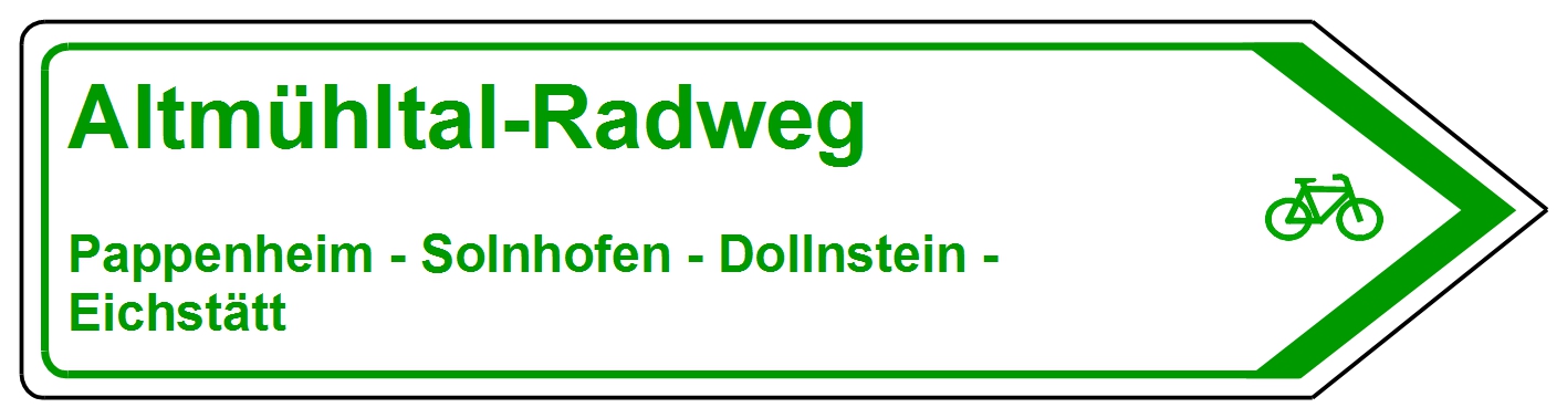 Altmühltal-Radweg, Solnhofen, Dollnstein, Eichstätt Es geht kurz hügelan, an der Vorfahrtstraße rechts und an der damit sofort erreichten nächsten Vorfahrtstraße links auf den sie begleitenden Geh- und Radweg. Den rechter Hand liegenden Bahnhof passierend und abwärts rollend halten Sie sich geradeaus, wenn die Straße rechts unter der Bahn hindurchführt, und dürfen sodann beschaulich zwischen Bahndamm und Altmühl radeln.