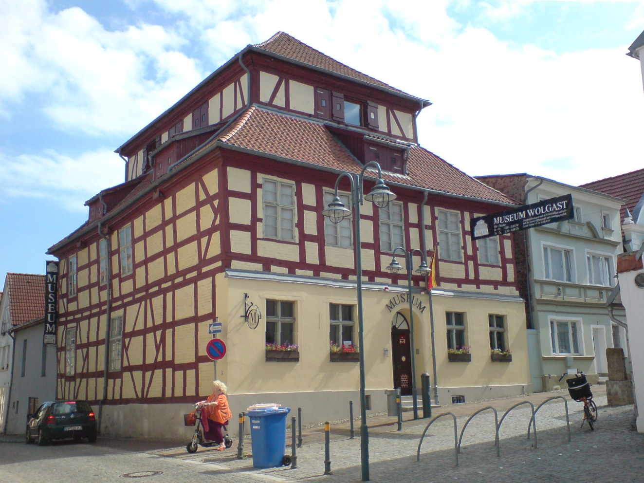 Bei einem Rundgang verdienen die Pfarrkirche St. Petri, die äußerlich sehr schlicht ist und vielleicht gerade deshalb so monumental wirkt, das Rathaus, dessen zwei Giebel den Nordischen Krieg widerspiegeln, denn der eine blieb mit seiner mittelalterlichen Gliederung erhalten, während der andere im Stil des Barock 1718-34 erneuert wurde, und schließlich die 'Kaffeemühle' am Rathausplatz 6 einen Blick. Nein, dies ist kein Café, keine Rösterei oder dergleichen, sondern das Stadtmuseum, das in einem zweigeschossigen Fachwerkbau aus dem 17. Jh. untergebracht ist, der einst als Kornspeicher diente und dessen Dachgeschoss rundum zurücktritt, was wohl den Volksmund zu der Bezeichnung animierte – geöffnet April-Okt. di-fr 11-18 h, sa & so 11-16 h, weitere Infos unter www.museum.wolgast.de.
