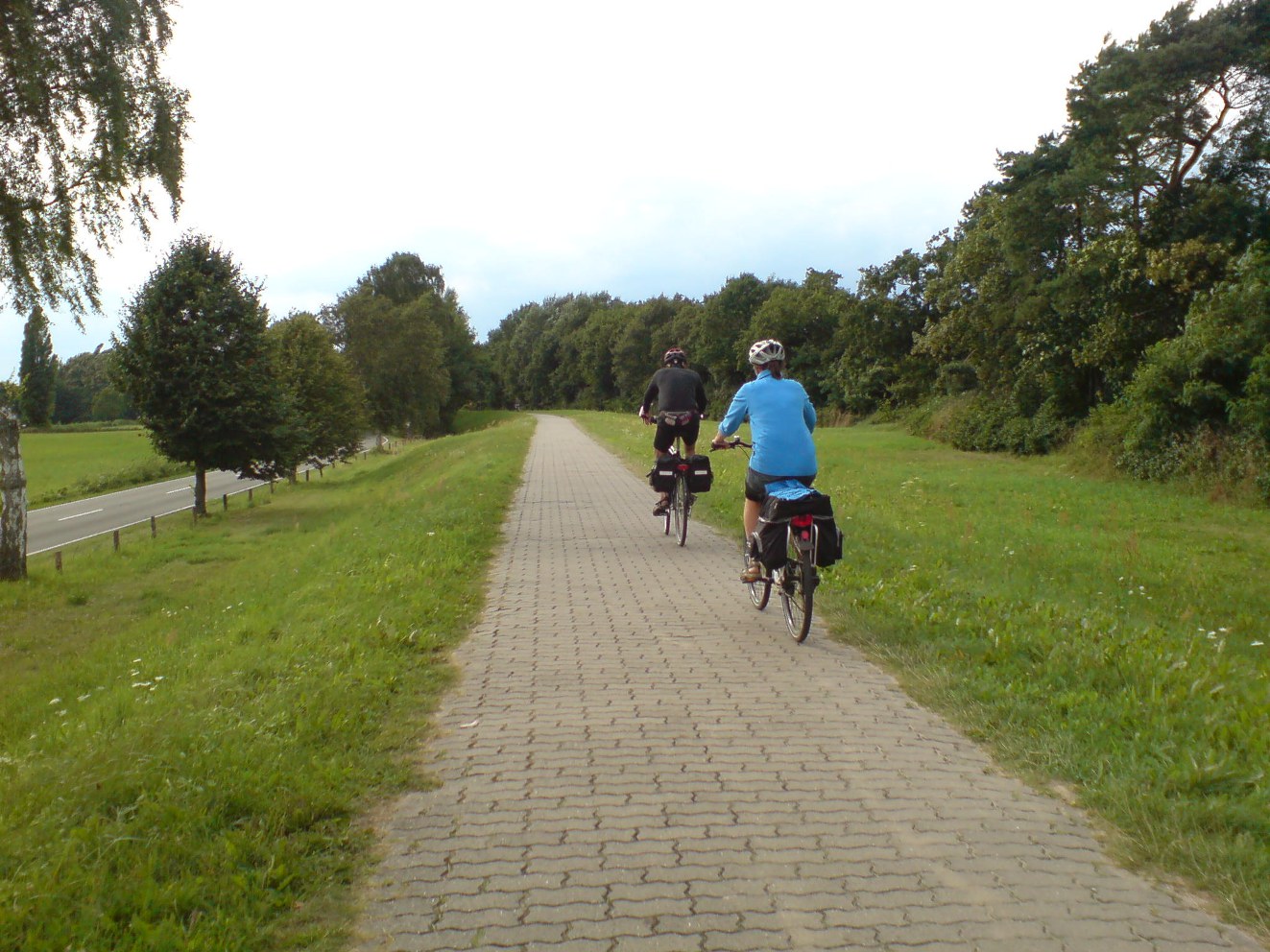 Sich am Hafen links haltend überqueren Sie den Deich und zweigen danach sofort rechts ab, um einem Betonspurplattenweg zu folgen. Wenn dieser Weg später nach links schwenkt, leitet ein Radhinweis rechts auf einen Pfad, der mit einem Solorad