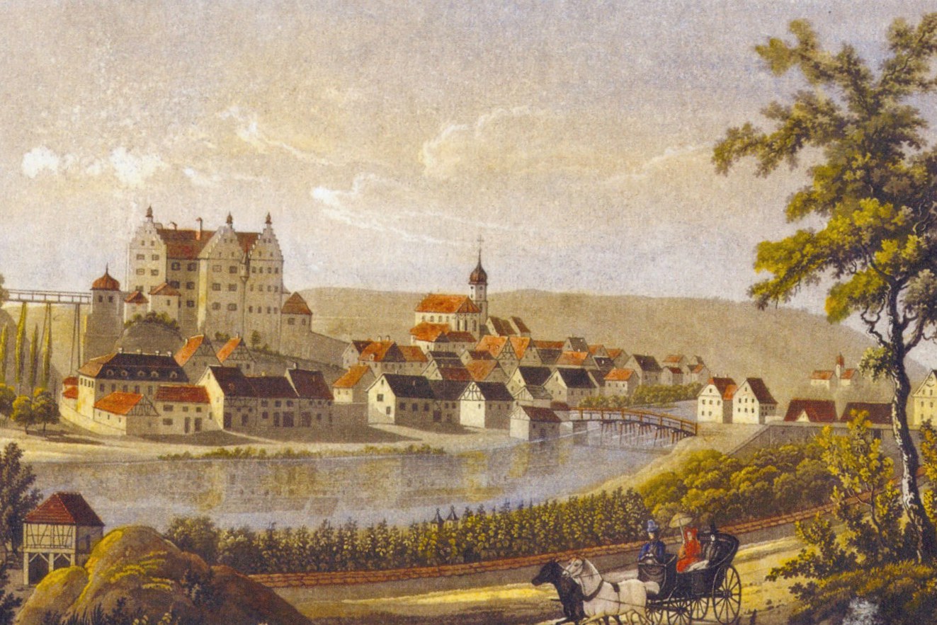 Schloss in Scheer, Donau-Radweg Die Skyline von Scheer, 577 m ü.NHN, 2.600 Einw., wird vom Schloss beherrscht, was nicht nur auf die beachtliche Größe, sondern vor allem darauf zurückzuführen ist, das es auf einem Felsen thront. Auf diesen Felsen bezieht sich wohl auch der Name der Stadt, denn er soll sich vom keltischen Wort „scera“ ableiten, welches schlicht und einfach „Fels“ bedeutet (Foto: H. Locher nach R. Bodmer).