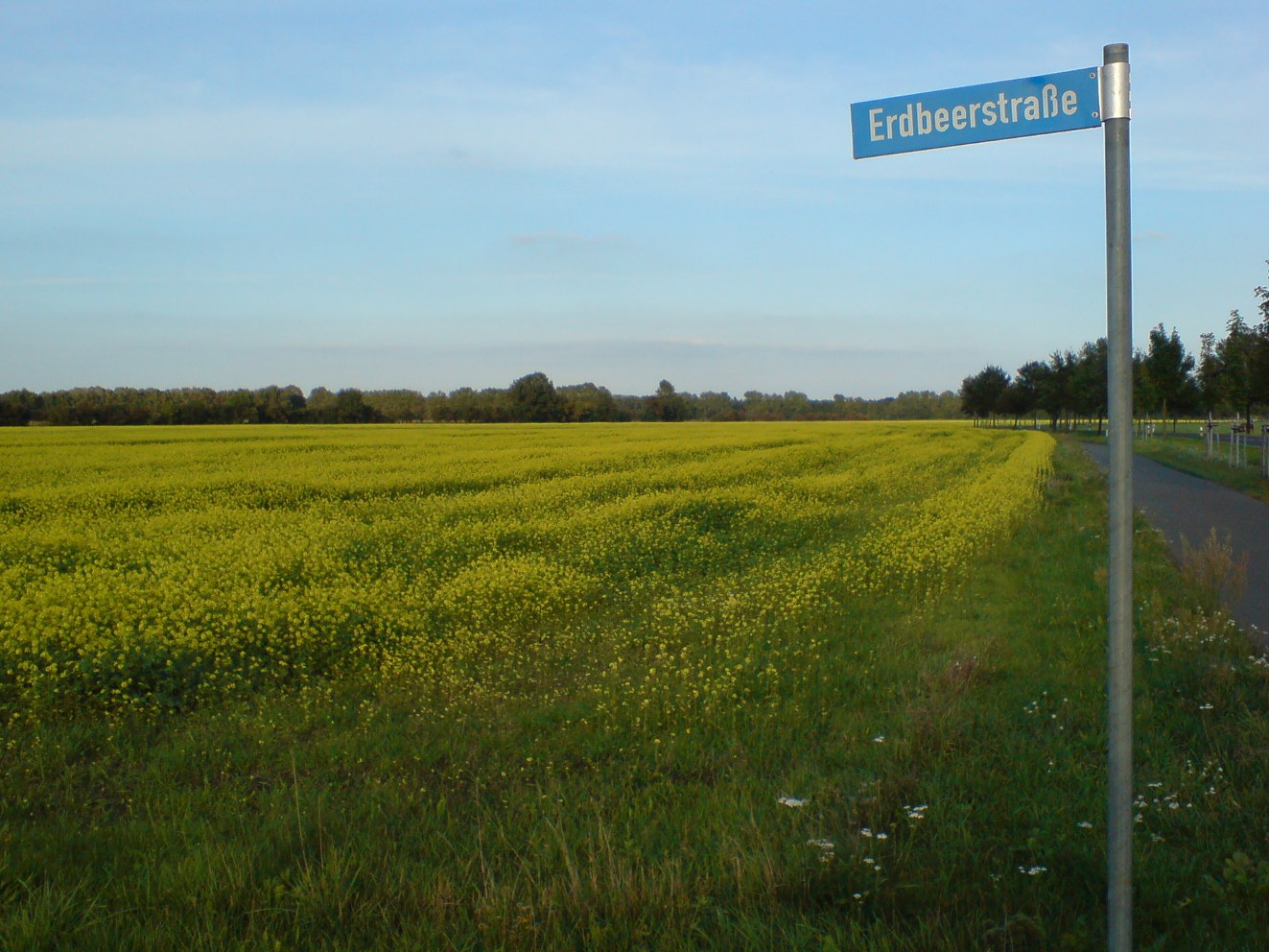 Rapsfeld am Ortsrand von JänickendorfDer leitet beständig entlang der Straße durch den sich lang hinziehenden Ort, wobei durchgängig glatter Asphalt geboten wird, der allerdings an den Grundstückszufahrten jeweils abgesenkt wurde, so dass Sie womöglich seekrank werden. Danach geht es wie gehabt auf der Skaterbahn weiter nach Holbeck, wo die Etappe am östlichen Ortsrand rechts über die Straße und sodann halblinks in den Wald und zum Holbecker See führt.