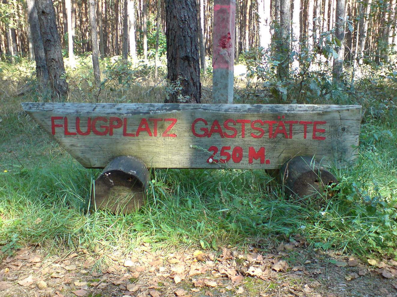 Hinweis zur Gaststätte beim Flugplatz ReinsdorfUnweit des Dorfangers quert die Etappe schräg die Bettina-von-Arnim-Straße und leitet zu einer Rampe, mittels der Sie einen weiten Linksbogen schlagen und sodann den Ort verlassen. Wieder wird hervorragender Rollbelag geboten, und so radeln Sie genüsslich durch den Wald und passieren dabei auch den Abzweig zum Flugplatz Reinsdorf, worauf ob der dortigen Gaststätte (direkt am Tower!) ein großer Holzhinweis aufmerksam macht.