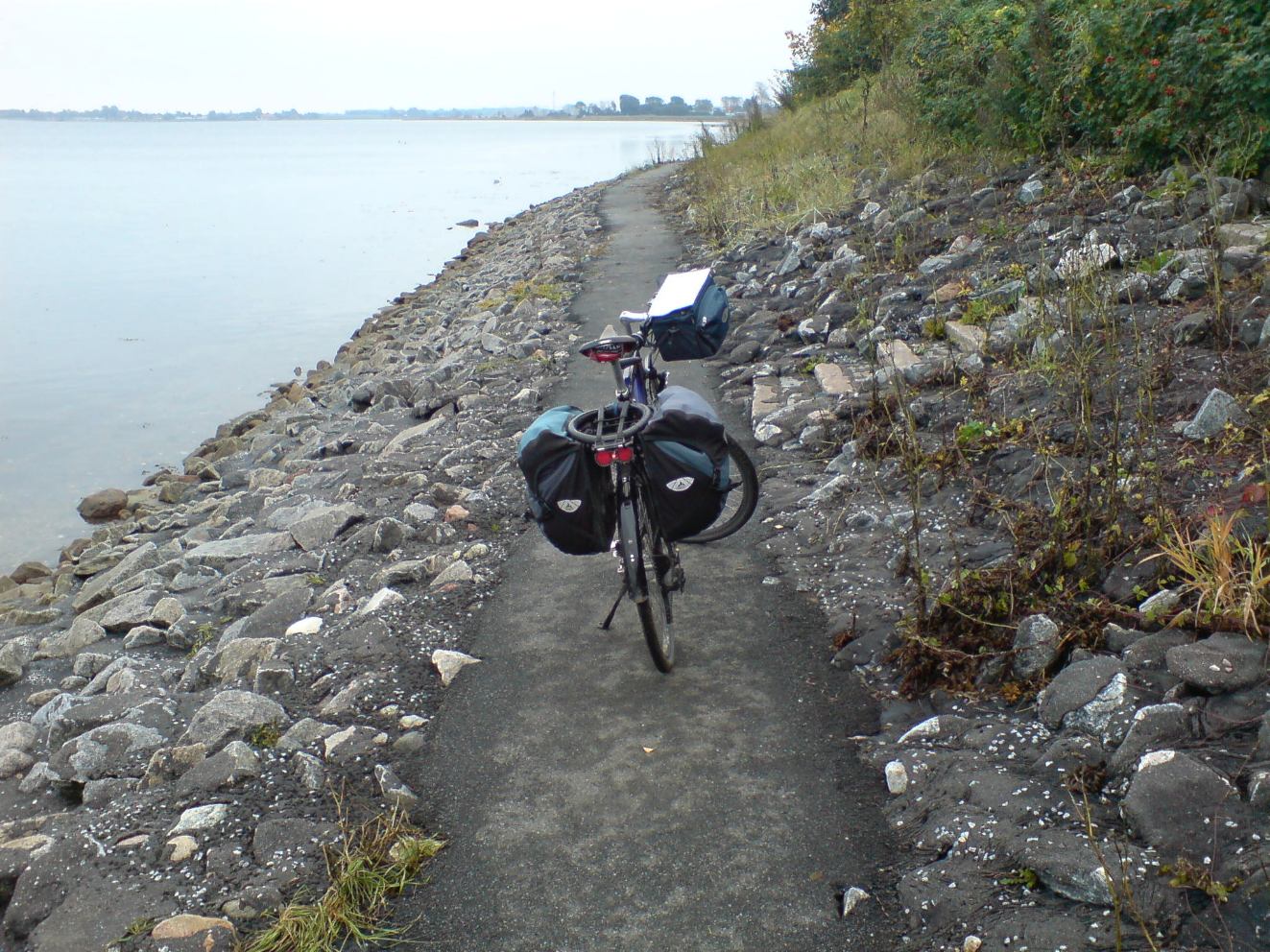 Jenseits werden Sie sogleich rechts auf einen groben Schotterweg gelenkt, auf dem Sie nach einer Linkskurve auch noch kurz hügelan radeln müssen ein Vergnügen ist das nicht gerade. Immerhin ist es nicht allzu weit bis zur Einmündung in eine Asphaltierte. Bald darauf knickt die Route links ab, bevor es auf Asphalt bis ans Ende einer Sackgasse geht. Bei dem dort gelegenen Haus schwenkt die Route nach links und damit direkt ans Ufer, wo Sie auf einem schmalen Asphaltstreifen auf dem mit groben Steinen befestigten Ufer balancieren dürfen.