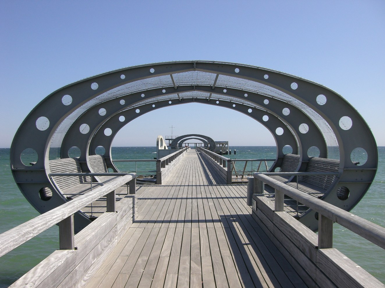 Stolz ist Kellenhusen auf seine neue, multifunktionale Seebrücke, auf der auch geheiratet werden kann, und die Promenade, 'Lady Prom' getauft, die nicht einfach schnurgerade am Strand entlang verläuft, sondern sich fantasievoll schlängelt und mit kleinen Wasserläufen, Findlingen, Ruhebuchten, Dünen, Irrgarten, Springbrunnen sowie 'Tümmler' und 'Orka' zwei großen Statuen bereichert wurde (Foto: Christian Korte).